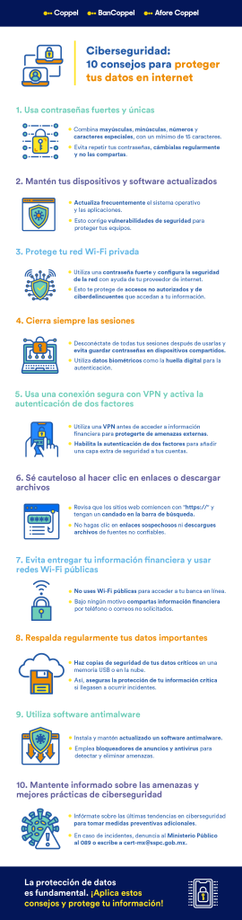Para evitar caer en situaciones fraudulentas en internet, es muy importante aprender sobre la protección de datos{"nd1":"Blog BanCoppel","nd2":"Articulo - Ciberseguridad: 10 consejos para proteger tus datos en internet","nd3":"protecci\u00f3n de datos","nd4":"","event":"blogBancoppel"} y hacer uso de diversas medidas de prevención. Considera utilizar las siguientes: